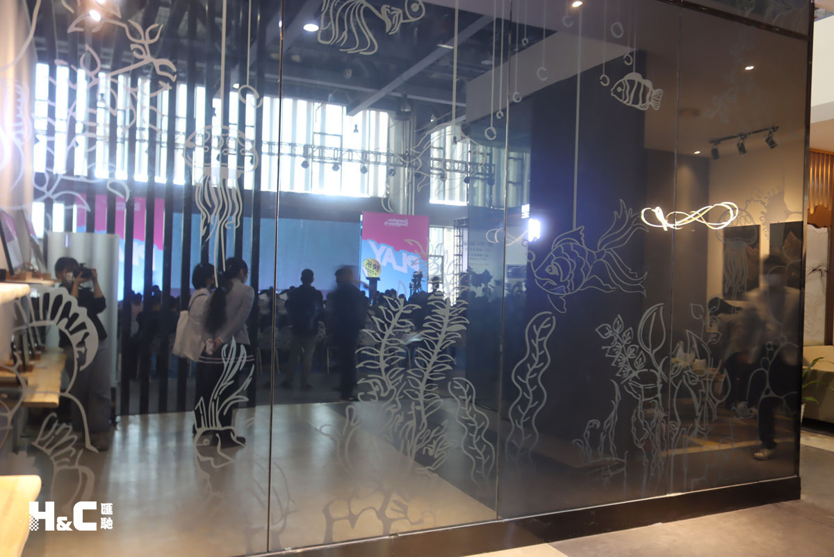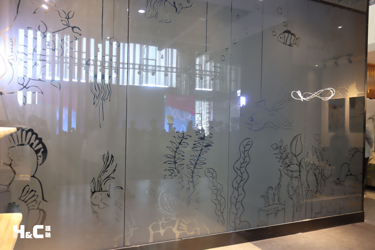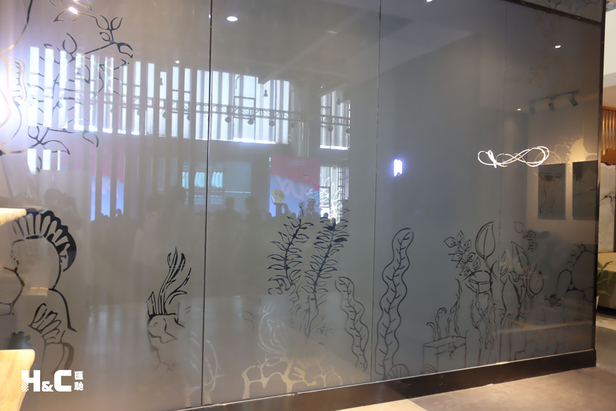 根據調光玻璃產品的特性和本質,我們結合了中國傳統剪紙藝術的手法以及鏡面反射的對比,以“孩童稚嫩般的畫風”的表現形式制作這幅4.9米*4.9米的巨幅手繪畫版。