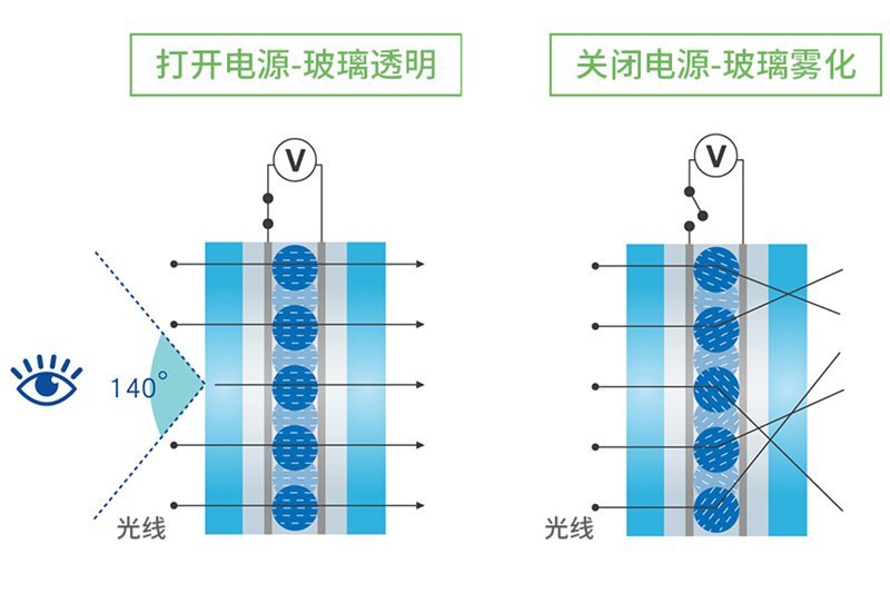 霧化玻璃,顧名思義,它是一種可以變霧化的玻璃,也有人稱之為調光玻璃、電霧玻璃。霧化狀態是霧化玻璃的常態,通過電后它會立即變成透明狀態。狀態的變化是一種物理變化,即玻璃中的液晶分子由不規則排列變成規則排列。