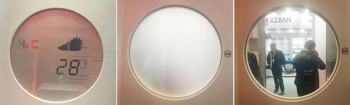 分區調光玻璃應用——時鐘,融合了公司LOGO、天氣、時間和溫度的顯示