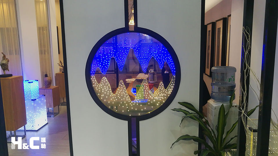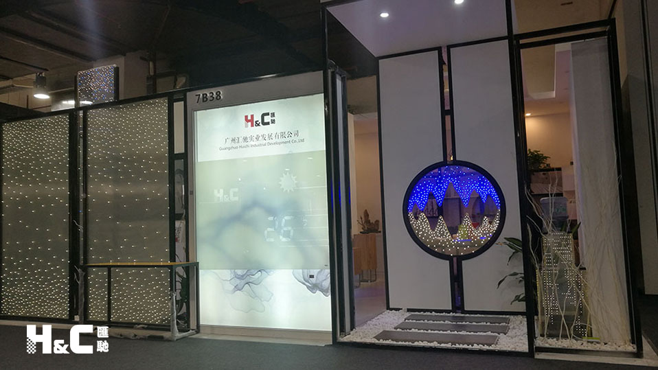 對于設計師來說,他們最想在展會上看到的,就是產品可以用在哪里。所以此次參展,廣州匯馳實業發展有限公司在展品上下了不少功夫,準備了多個產品的創意應用展示,讓設計師們更加直觀地了解新型分區調光玻璃(霧化玻璃)的原理和應用。
